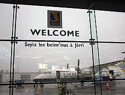 Welcome sign at Jersey Airport in English and Jèrrais.