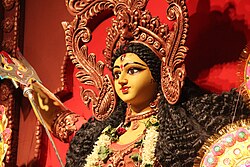 Hinduism, states Professor of Indian Religion Edwin Bryant, has the strongest presence of the divine feminine among major world religions, from ancient times to the present.[46] The goddess is viewed as central in Shakti and Saiva Hindu traditions.[47][48] In Hinduism, women are portrayed as equal in value to men. For instance, Kali Ma (Dark Mother) "is the Hindu goddess of creation, preservation, and goddess of destruction." Her power included the origin of all creation's life, as well as the end of life.[49] Due to her control over life and death, Kali was seen as a goddess who should be loved as well as feared. This leads to a higher status for the woman than the man, because everyone has to respect her in order to have a smooth life and live longer. Another important female figure is Shakti or Adishakti or Adiparashakti, the divine feminine - a goddess that embodies the energy of the universe, "often appearing to destroy demonic forces and restore balance".[50] Because Shakti is a universal force, she embodies all the gods in Hinduism and is worshiped as the "mother goddess". In Hindu lore, the Goddess is referred as Devi or Devi Ma, meaning Mother Goddess. The Goddess is considered as the progenitor, sustainer and ultimately, the destroyer of the universe. She is worshipped as Durga - the warrior Goddess, Kali - the Goddess of time and death and regeneration, Lalita Tripurasundari - the divine lady of All Worlds and as Bhuvaneshwari, the Goddess of the Universe. The Goddess is worshipped in many forms as Lakshmi, the Goddess of wealth, fortune and prosperity and as Saraswati, the Goddess of knowledge, arts, education and learning.