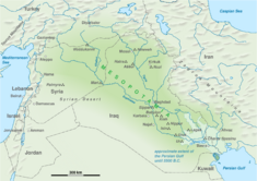 Mesopotamia means "(Land) between two rivers" in ancient Greek, referring to the land between the Tigris and Euphrates rivers, but the region can be broadly defined to include the area that is now most of Iraq, eastern Syria, southeastern Turkey.[1] The oldest known occurrence of the name Mesopotamia dates to the 4th century BCE, when it was used to designate the land east of the Euphrates in north Syria.[2] In modern times it has been more generally applied to all the lands between the Euphrates and the Tigris,[citation needed] thereby incorporating not only parts of Syria but also almost all of Iraq and southeastern Turkey, and parts of southwestern Iran.[3] The neighboring steppes to the west of the Euphrates and the western part of the Zagros Mountains are also often included under the wider term Mesopotamia.[4][5][6] A further distinction is usually made between Upper or Northern Mesopotamia and Lower or Southern Mesopotamia.[7] Upper Mesopotamia, also known as the Jazirah, is the area between the Euphrates and the Tigris from their sources down to Baghdad.[4] Lower Mesopotamia is the area from Baghdad to the Persian Gulf.[7] In modern scientific usage, the term Mesopotamia often also has a chronological connotation. In modern Western historiography of the region, the term "Mesopotamia" is usually used to designate the area from the beginning of time, until the Muslim conquest in the 630s, with the Arabic names Iraq and Jazirah being used to describe the region after that event.[3][8]