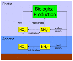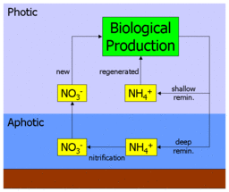 Crucially, this process is believed to only occur in the absence of light (or as some other function of depth). In the ocean, this leads to a vertical separation of nitrification from primary production, and confines it to the aphotic zone. This leads to the situation whereby any nitrate in the water column must be from the aphotic zone, and must have originated from organic material transported there by sinking. Primary production fuelled by nitrate is, therefore, making use of a "fresh" nutrient source rather than a regenerated one. Production by nitrate is thus referred to as new production.[5]