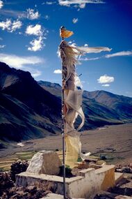 The prayers of a flag become a permanent part of the universe as the images fade from exposure to the elements. Just as life moves on and is replaced by new life, Tibetans renew their hopes for the world by continually mounting new flags alongside the old. This act symbolizes a welcoming of life's changes and an acknowledgment that all beings are part of a greater ongoing cycle.