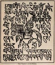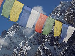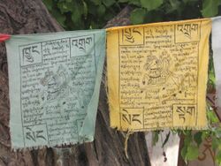 Prayer flags are believed to have originated within the religious tradition of Bon.[1] In Bon, shamanistic Bonpo used primary-colored plain flags in Tibet.[2] Traditional prayer flags include woodblock-printed text and images.