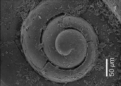The chirality in gastropods appears in early cleavage (spiral cleavage) and the gene NODAL is involved.[6] A more recent study (2013) correlates the asymmetric coiling of the shell by the left-right asymmetric expression of the decapentaplegic gene in the mantle.[7]