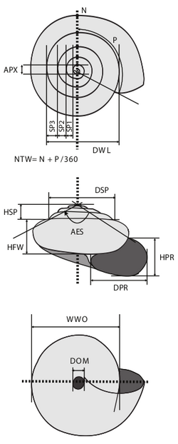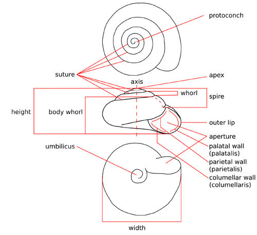 The most frequently used measurements of a gastropod shell are: the height of the shell, the width of the shell, the height of the aperture and the width of the aperture. The number of whorls is also often used.