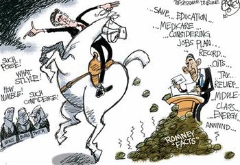Political cartoon accusing Mitt Romney of Gish Galloping.