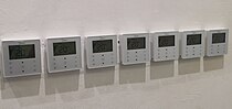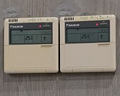 A wired controller, also called a "wired thermostat" is a device that controls an air conditioner by switching heating or cooling on or off. It uses different types of sensors to measure temperatures and actuate control operations. Mechanical thermostats commonly use bimetallic strips, converting a temperature change into mechanical displacement, to actuate control of the air conditioner. Electronic thermostats, instead, they use a thermistor or other semiconductor sensor, processing temperature change as electronic signals to control the air conditioner.