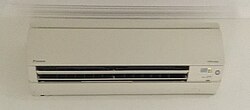 The first mini-split system was sold in 1961 by Toshiba in Japan, and the first wall-mounted mini-split air conditioner was sold in 1968 in Japan by Mitsubishi Electric where small home sizes motivated their development. The Mitsubishi model was the first air conditioner to have a cross-flow fan.[53][54][55] In 1969, the first mini-split air conditioner was sold in the US.[56] Multi-zone ductless systems were invented by Daikin in 1973, and variable refrigerant flow systems (which can be thought of as larger multi-split systems) were also invented by Daikin in 1982. Both were first sold in Japan.[57] Variable refrigerant flow systems when compared with central plant cooling from an air handler, eliminate the need for large cool air ducts, air handlers, and chillers; instead cool refrigerant is transported through much smaller pipes to the indoor units in the spaces to be conditioned, thus allowing for less space above dropped ceilings and a lower structural impact, while also allowing for more individual and independent temperature control of spaces, and the outdoor and indoor units can be spread across the building.[58] Variable refrigerant flow indoor units can also be turned off individually in unused spaces.[citation needed] The lower start-up power of VRF's DC inverter compressors and their inherent DC power requirements also allow VRF solar-powered heat pumps to be run using DC-providing solar panels.