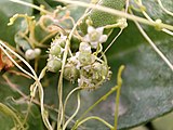 Cuscuta can be identified by its thin stems appearing leafless, with the leaves reduced to minute scales. In these respects it closely resembles the similarly parasitic, but unrelated genus, Cassytha. From mid-summer to early autumn, the vines can produce small fruit that take the same color as the vine, and are approximately the size of a common pea. It has very low levels of chlorophyll; some species such as Cuscuta reflexa can photosynthesize slightly, while others such as C. europaea are entirely dependent on the host plants for nutrition.[6]