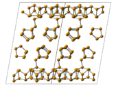 White phosphorus exists in two crystalline forms: α (alpha) and β (beta). At room temperature, the α-form is stable. It is more common, has cubic crystal structure and at 195.2 K (−78.0 °C), it transforms into β-form, which has hexagonal crystal structure. These forms differ in terms of the relative orientations of the constituent P4 tetrahedra.[5][6] The β form of white phosphorus contains three slightly different P4 molecules, i.e. 18 different P-P bond lengths between 2.1768(5) and 2.1920(5) Å. The average P-P bond length is 2.183(5) Å.[7]