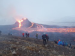 People on the slopes of Fagradalsfjall, watching the Geldingadalir eruption 2021.