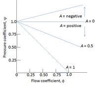 This equation also gives the off-design characteristic of an axial-flow compressor. The figure shown below depicts theoretical characteristic curves for some values of the constant [math]\displaystyle{ A }[/math]. For positive values of [math]\displaystyle{ A }[/math], the curves are falling, while for negative values rising characteristics are obtained.