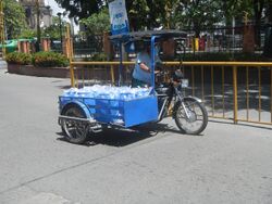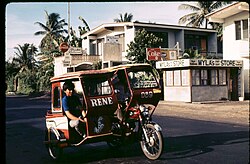 From Handwiki In the Philippines, motorized tricycles, or simply tricycles (Filipino: traysikel; Cebuano: traysikol), refer to a type of motorized vehicle consisting of a motorcycle and a passenger cab attached to it. Along with the jeepney, the Philippine tricycle is one of the most common means of public or private transportation in the country, especially in rural areas. These public utility vehicles either ply a set route or are for-hire, like taxis.[1]