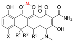Structural depiction of tetracycline metal chelation, where 'M' is a metal such as those found in antacids