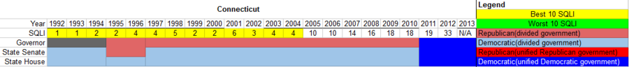The chart below depicts the partisanship of the Connecticut state government and the state's SQLI ranking for the years studied. For the SQLI, the states were ranked from 1-50, with 1 being the best and 50 the worst. Between the years 1992 and 2005, Connecticut ranked in the top-10 in the SQLI ranking, in the top-5 for twelve of those thirteen years, and ranked 1st in 1992 and 1993. Beginning 2005, Connecticut dropped out of the top-10 and began a trend downward until hitting its lowest spot during the period of the study (33rd in 2012). Connecticut had divided government for eighteen years before having a Democratic trifecta in 2011. The state’s greatest decline in the SQLI ranking occurred between 2011 and 2012, when Connecticut dropped fourteen spots in the rankings. Connecticut has never had a Republican trifecta between 1992 and 2012.