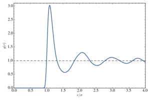 An equivalent representation of these correlations is the radial distribution function [math]\displaystyle{ g(r) }[/math], which is related to the Fourier transform of [math]\displaystyle{ S(q) }[/math].[51] It represents a spatial average of a temporal snapshot of pair correlations in the liquid.