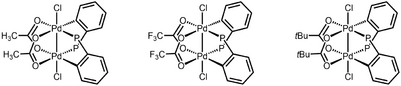 The first example of a dipalladium(III) complex was obtained by oxidation of dinuclear Pd(II) complex of triazabicyclodecene.[6]