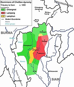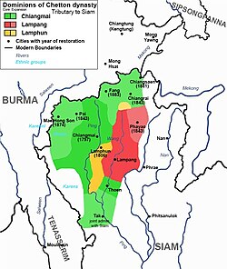Rulers of Chiang Mai laid traditional claims over 'fifty-seven' cities and towns of former Lanna kingdom. This claim included modern Northern Thailand, Tai Lue towns of Mong Yawng, Vieng Phouka and Luang Namtha to the east, Kengtung to the north and Salween Shan States of Monghsat, Mongpu and Mongpan to the northwest. However, in reality, Chetton dynasty had powers in core Lanna territories centered around Chiang Mai, Lampang and Lamphun. Kengtung and Salween Shan States were under Burmese suzerainty. Chetton dynasty did not have authorities over 'Eastern Lanna' including Nan, Phrae, Chiang Khong, Thoeng and Chiangkham, in which Nan and Phrae were ruled by their own local dynasties. 'Northern Lanna', including Chiang Saen, Chiang Rai, Phayao and Fang were left depopulated in early nineteenth century to create buffer zone with Burma until they were later restored (Chiang Rai and Phayao in 1843, Chiang Saen and Fang in 1881)[14] by migrations from Chiang Mai and Lampang. Each of the princedoms – Chiang Mai, Lampang and Lamphun – had their own satellite towns under their jurisdictions;
