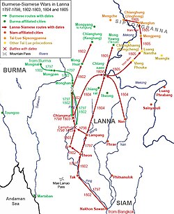 After decades of Burmese-Siamese Wars, Lanna, as the frontline battlegrounds, was ravaged by warfare and faced manpower shortage. After reestablishment of Chiang Mai in 1797, Kawila and other Lanna lords pursued the policy of "putting vegetables into baskets, putting people into towns"[6] to wage wars to acquire manpower. Elimination of Burmese influence in Lanna in 1804 allowed Lanna lords to expand their dominions and military campaigns to the northernmost Tai princely states including Kengtung and Chiang Hung Sipsongpanna, which were known collectively as Lue-Khuen (ลื้อเขิน) in Thai sources. Trans-Salween states to the east of Salween River had political and cultural affinity towards Lanna and centers other than Burma.[8] These states were the main victims of Lanna's subjugations and subsequent forced resettlements into Lanna towns previously damaged and depopulated.[6] In 1805, Thammalangka captured Mong Yawng.[6] In the same year, around 10,000 people, including Tai Khuen people from Kengtung along with its saopha Sao Kawng Tai and Tai Lue people from Mong Yawng, were deported to settle in Chiang Mai and Lamphun, respectively, leading to foundation of Lamphun as the third princely seat in 1806. These major events were accompanied by minor rounds of deportation that gradually transferred population from northernmost Tai states into Lanna.