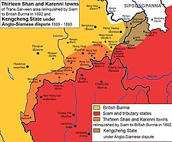 After Third Anglo-Burmese War in 1885, as the British took control of Shan States by 1889, they began to take eyes on these teak-rich trans-Salween states. Siam took quick action by laying claims on trans-Salween Shans towns. In 1884, Prince Phichit Prichakorn the Kha Luang of Chiang Mai organized the 'Five Shan Towns' (เมืองเงี้ยวทั้งห้า) of Mong Hsat, Mongton, Monghang, Mongkyawt and Monghta, also including Karenni towns of Mongmau and Mehsakun, into a single administrative unit called Wiang Chaipricha (เวียงไชยปรีชา) and sent forces to occupy this area in 1889. However, the British viewed these towns as belonging to Shan states of Mongpan and Mawkmai,[25] which were under British control. In 1889, the British Government of India requested Bangkok to settle the Trans-Salween boundaries and sent a commission led by Ney Elias for the task. However, Siamese representatives did not show up at the place so Elias was obliged to conduct frontier exploration in December 1889 without Siamese participation. During the expedition, Elias met with Siamese garrisons who agreed to leave the area at Elias' requests.[25]