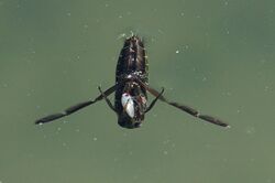 Mature females, however, will also dive to the bottom of the pond to feed on isopods (Asellus), but only in shallow waters.[19] Reaching Asellus requires a higher travel cost of energy. This behaviour is not consistent with the optimal foraging theory.[19] It is possible, however, that because mature females are larger than males and immature females, they have a reduced buoyancy and therefore require less energy to capture Asellus.[20] Also, mature females have a larger abdominal size, which could support a larger air bubble and allow them to remain submerged for longer.[19] However, if the water depth increases, mature females will switch and spend more time at the surface and not feed on Asellus, as the deep water increases the amount of energy needed for diving and staying submerged.[19]