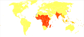 In 2015 about 38.5 million people were infected.[5] About 950 million people are at risk of the disease in 54 countries.[2] It is most common in tropical Africa and Asia.[2] The condition has been described throughout ancient history.[8] Lymphatic filariasis is classified as a neglected tropical disease and one of the four main worm infections.[7] The impact of the disease results in economic losses of billions of dollars a year.[2]