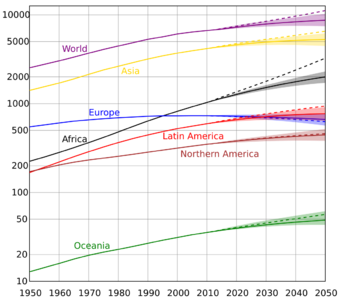 Jane Falkingham of Southampton University has noted that "We've actually got population projections wrong consistently over the last 50 years… we've underestimated the improvements in mortality… but also we've not been very good at spotting the trends in fertility."[14] In 2004 a United Nations office published its guesses for global population in the year 2300; estimates ranged from a "low estimate" of 2.3 billion (tending to −0.32% per year) to a "high estimate" of 36.4 billion (tending to +0.54% per year), which were contrasted with a deliberately "unrealistic" illustrative "constant fertility" scenario of 134 trillion (obtained if 1995–2000 fertility rates stay constant into the far future).[14][31]