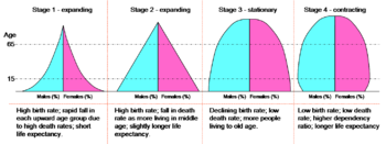 In demography, demographic transition is a phenomenon and theory which refers to the historical shift from high birth rates and high death rates in societies with minimal technology, education (especially of women) and economic development, to low birth rates and low death rates in societies with advanced technology, education and economic development, as well as the stages between these two scenarios.[1] In economic growth, the demographic transition has swept the world over the past two centuries, and the unprecedented population growth of the post-Malthusian period was reversed, reducing birth rates and population growth significantly in all regions of the world, and enabling economies to translate more of the gains of factor accumulation and technological progress into per capita income growth. The demographic transition strengthens economic growth process by three changes: (i) reduced dilution of capital and land stock, (ii) increased investment in human capital, and (iii) increased size of the labor force relative to the total population and changed age population distribution.[2] Although this shift has occurred in many industrialized countries, the theory and model are frequently imprecise when applied to individual countries due to specific social, political and economic factors affecting particular populations.[1]