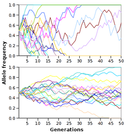 Genetic drift is the random fluctuation of allele frequencies within a population from one generation to the next.[89] When selective forces are absent or relatively weak, allele frequencies are equally likely to drift upward or downward[clarification needed] in each successive generation because the alleles are subject to sampling error.[90] This drift halts when an allele eventually becomes fixed, either by disappearing from the population or by replacing the other alleles entirely. Genetic drift may therefore eliminate some alleles from a population due to chance alone. Even in the absence of selective forces, genetic drift can cause two separate populations that begin with the same genetic structure to drift apart into two divergent populations with different sets of alleles.[91]