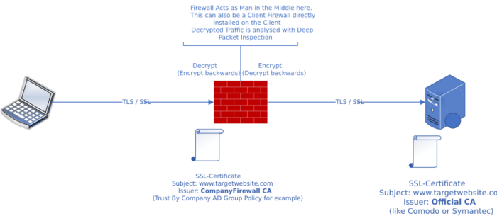 With increased use of HTTPS and privacy tunneling using VPNs, the effectiveness of DPI is coming into question.[61] In response, many web application firewalls now offer HTTPS inspection, where they decrypt HTTPS traffic to analyse it.[62] The WAF can either terminate the encryption, so the connection between WAF and client browser uses plain HTTP, or re-encrypt the data using its own HTTPS certificate, which must be distributed to clients beforehand.[63] The techniques used in HTTPS/SSL Inspection (also known as HTTPS/SSL Interception) are the same used by man-in-the-middle (MiTM) attacks[64]