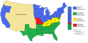 From Conservapedia The 1860 election was hotly divided between North and South over the issue of slavery. The Republican party, hated in the South, nominated Abraham Lincoln. The south was divided in its choice for a candidate, deadlocking the Democratic National Convention by their insistence that the platform advocate allowing slavery in every territory. They also refused to accept Stephen A. Douglas, who had formerly said that a territory could prohibit slavery by refusing to pass legislation protecting it.[1] As a result, the Democratic party split: the Northern Democrats nominated Stephen A. Douglas and the Southern Democrats nominated Vice-President John C. Breckinridge. A few former Whigs, calling themselves the Constitutional Union Party, also nominated a Presidential candidate with the sole platform of preserving the Union. Lincoln was not even on the ballot in most Southern states. The results showed: