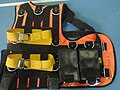 The jacket harness is a waistcoat (vest) style garment with strong adjustable webbing straps which are adjustable and securely buckled over the shoulders, across the chest and waist, and through the crotch or around each thigh, so that the diver can not slide out under any predictable circumstance. The harness is fitted with several heavy duty D-rings, fixed to the webbing in such a way that the full weight of the diver and all their equipment can be safely supported. A minimum strength of 500 kgf is recommended or required by some codes of practice. A jacket harness is usually provided with webbing straps or a cloth pocket on the back to support the bailout cylinder, may have a variety of pockets to carry tools, and may also carry ditchable or fixed main weights. There are usually several strong D-rings to secure the umbilical and other equipment.[4]
