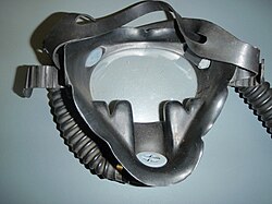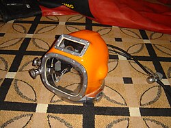 The helmet may be of metal[5] or reinforced plastic composite (GRP), and is either connected to a neck dam or clamped directly to a dry suit. The neck dam is the lower part of the helmet, which seals against the neck of the diver in the same way that the neck seal of a dry suit works. Neck dams may have neoprene or latex seals, depending on diver preference. Attachment to the neck dam is critical to diver safety and a reliable locking mechanism is needed to ensure that it is not inadvertently released during a dive. When using a dry suit, the neck dam may be permanently omitted and the lower part of the helmet assembly attached directly to the suit.[6]