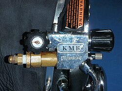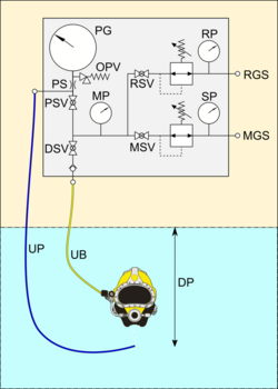 The pneumo line is usually a 0.25 inches (6.4 mm) bore hose in the diver's umbilical, supplied with breathing gas from the gas panel via a supply valve. Downstream from the valve there is a branch to a high resolution pressure gauge, a restriction to flow to the gauge, and an overpressure relief valve to protect the gauge from full panel supply pressure in case the pneumo line is used for emergency breathing gas supply. Each diver has an independent pneumofathometer, and if there is a bell, it will also have an independent pneumofathometer.[26]