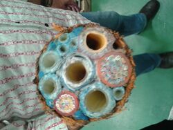 The umbilical contains a hose to supply the breathing gas and usually several other components, which may be stipulated by legislation or code of practice.[25] These usually include a communications cable (comms wire), a pneumofathometer, and a strength member, which may be the airline hose, communications cable, or a rope. When needed, a hot water supply line, helium reclaim line, video camera and lighting cables may be included. These components are neatly twisted into a multistrand cable, and are deployed as a single unit. The diver's end has underwater connectors for the electrical cables, and the air hoses are usually connected to the helmet, band mask, or bailout block by JIC fittings. A screw-gate carabiner or similar connector is provided on the strength member for attachment to the diver's harness, and may be used to lift the diver in an emergency. Similar connections are provided for attachment to the diving bell, if used, or to the surface gas panel and communications equipment. A diver's umbilical supplied from a bell gas panel is called an excursion umbilical, and the supply from the surface to the bell panel is the bell umbilical.[26][27]