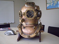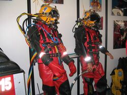 Surface-supplied diving equipment (SSDE) is the equipment required for surface-supplied diving. The essential aspect of surface-supplied diving is that breathing gas is supplied from the surface, either from a specialised diving compressor, high-pressure gas storage cylinders, or both. In commercial and military surface-supplied diving, a backup source of surface-supplied breathing gas should always be present in case the primary supply fails. The diver may also wear a bailout cylinder (emergency gas supply) which can provide self-contained breathing gas in an emergency. Thus, the surface-supplied diver is less likely to have an "out-of-air" emergency than a scuba diver using a single gas supply, as there are normally two alternative breathing gas sources available. Surface-supplied diving equipment usually includes communication capability with the surface, which improves the safety and efficiency of the working diver.[1]