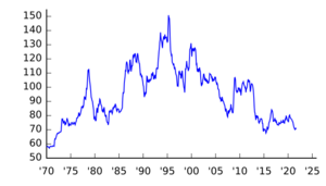 The origins of endaka began in 1971 with the Smithsonian Agreement. The term was coined with the first usage in 1985 during the Plaza Accord, in which the yen was revalued sharply overnight. However, its use in the context of recession was first used in 1992[citation needed], when Japan's economy slowed down, and again in 1995, when the yen hit its then-postwar high of 79 to the dollar.