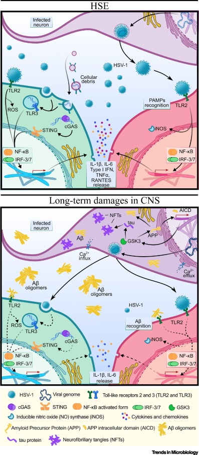 HSE is thought to be caused by the transmission of virus from a peripheral site on the face following HSV-1 reactivation, along a nerve axon, to the brain.[1]
