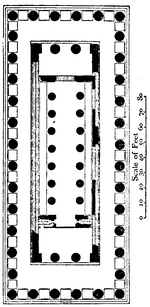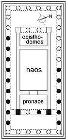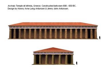 The Corinthians are considered to be the inventors of the Doric order. However Corinth was completely destroyed and rebuilt and there is not sufficient evidence for the existence of earliest Doric Greek temples in the city.[145] A building constructed in early 7th century BC c.690-650 BC at Isthmia near Corinth which was later dedicated to Poseidon, is considered a pioneering building featuring Doric architecture.[146] It seems that the first temple with pure Doric elements was built with the aid of Corinthians at Thermon in Aetolia in the middle of 7th century BC century. c.640-630 BC. It was a peripteral narrow wooden structure dedicated to Apollo,[147] It measured 12.13 X38.23 m at the stylobate and the number of pteron columns was 5X15.[148]