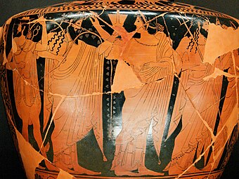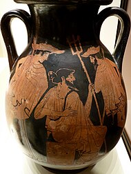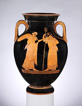 At some point, Poseidon promised three favours to Theseus, and he called upon Poseidon to fulfill one of those when Phaedra falsely accused Hippolytus of forcing himself on her.[196] Theseus, not knowing the truth, asked his father to destroy Hippolytus; Poseidon granted his son's wish, and as Hippolytus was driving by the sea, Poseidon sent a terrifying sea monster to spook the man's horses, which then dragged him to his death.[196][197]