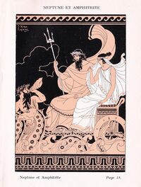 Poseidon was said to have had many lovers of both sexes. His consort was Amphitrite, a nymph and ancient sea-goddess, daughter of Nereus and Doris. In one account, attributed to Eratosthenes, Poseidon wished to wed Amphitrite, but she fled from him and hid with Atlas. Poseidon sent out many to find her, and it was a dolphin who tracked her down. The dolphin persuaded Amphitrite to accept Poseidon as her husband, and eventually took charge of their wedding. Poseidon then put him among the stars as a reward for his good services.[198] Oppian says that the dolphin betrayed Amphitrite's whereabouts to Poseidon, and he carried off Amphitrite against her will to marry her.[199] Together they had a son named Triton, a merman.[200] Poseidon was the father of many heroes. He is thought to have fathered the famed Theseus. Poseidon also had an affair with Alope, his granddaughter through Cercyon, his son and King of Eleusis, begetting the Attic hero Hippothoon. Cercyon had his daughter buried alive but Poseidon turned her into the spring, Alope, near Eleusis.[201]