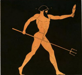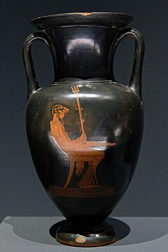 His symbol is the trident and he has the epithet Eutriaina (Εὐτρίαινα), "with goodly trident" (Pindar).[104] The god of the sea is also the god of fishing, and tuna was his attribute. At Lampsacus they offered fishes to Poseidon and he had the epithet phytalmios (φυτάλμιος) [105] His epithet Phykios (Φύκιος), "god of seaweeds" at Mykonos,[106] seems to be related with fishing. He had a fest where women were not allowed, with special offers also to Poseidon Temenites (Τεμενίτης) "related to an official domain ".[107] At the same day they made offers to Demeter Chloe therefore Poseidon was the promotor of vegetation. He had the epithet phytalmios (φυτάλμιος) at Myconos, Troizen, Megara and Rhodes, comparable with Ptorthios (Πτόρθιος) at Chalcis.[105][108][109]