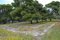 At Lycosura he is related with the cult of Despoina.[112] The modern sanctuary near Mantineia was built by Emperor Hadrian.[113] In Athens on the hill of horses there was the altar of Poseidon Hippios and Athena Hippia. The temple of Poseidon was destroyed by Antigonus when he attacked Attica.[114] He is usually the tamer of horses (Damaios,Δαμαίος at Corinth),[115] and the tender of horses Hippokourios Ἱπποκούριος) at Sparta, where he had a sanctuary near the sanctuary of Artemis Aiginea.[116][117] In some myths he is the father of horses, either by spilling his seed upon a rock or by mating with a creature who then gave birth to the first horse.[2] In Thessaly he had the title Petraios Πετραἵος, "of the rocks".[118] He hit a rock and the first horse "Skyphios" appeared.[119] He was closely related with the springs, and with the strike of his trident, he created springs. He had the epithets Krenouchos (Κρηνούχος), "ruling over springs",[120] and nymphagetes (Νυμφαγέτης) "leader of the nymphs" [121] On the Acropolis of Athens he created the saltspring Sea of Erechtheus (Ἐρεχθηίς θάλασσα).[122] Many springs like Hippocrene and Aganippe in Helikon are related with the word horse (hippos). (also Glukippe, Hyperippe). He is the father of Pegasus, whose name is derived from πηγή, (pēgē) "spring".[123]