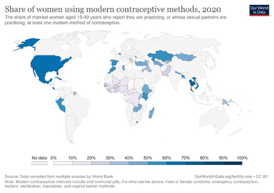 World map colored according to modern birth control use. Each shading level represents a range of six percentage points, with usage less than or equal to: