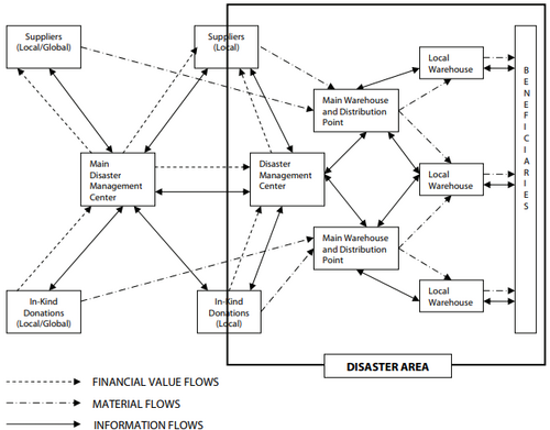- The flow of material: the flow of products from donors to beneficiaries, including food, blankets, medicines, and water, and the reverse flow of returned products after disasters.
