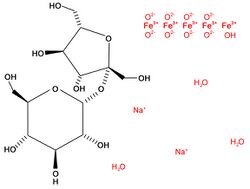 Intravenous iron is administered directly to the bloodstream, in a form of iron carbohydrate complexes, such as iron dextran and iron sucrose. The complex is composed of a polynuclear Fe3+ hydroxide core with a surrounding carbohydrate shell.[4] In the body, the iron complex behaves like a prodrug, releasing the iron from the Fe3+ hydroxide core via metabolism.