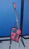 The 1980s-era SynthAxe was a futuristic controller consisting of a fretboard attached to the body at an obtuse angle.[10] The fretboard strings were used to indicate pitch and sensed string bends. A separate, shorter set of strings were used for picking and strumming. These triggered the notes fretted on the fretboard's strings. It also featured trigger keys that could be used instead of the trigger strings. A whammy bar was assignable to any MIDI parameter. The SynthAxe was prohibitively expensive and therefore not widely used. Two of the most famous SynthAxe users are guitarist Allan Holdsworth and percussionist Roy "Futureman" Wooten of the jazz quartet Béla Fleck and the Flecktones. Wooten programmed his modified SynthAxe controller with a variety of drum kit and percussion sounds. The instrument was previously owned by jazz guitarist Lee Ritenour.