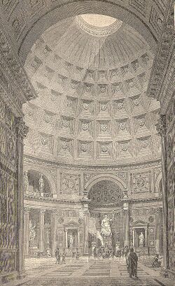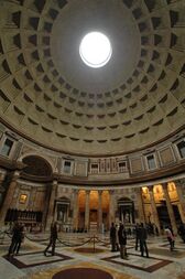 Cements were essential to the design of the Pantheon. The mortar used in the construction of the dome is made up of a mixture of lime and the volcanic powder known as, pozzolana. The concrete is suited for the use in constructing thick walls as it does not require to be completely dry in order to cure.[7]