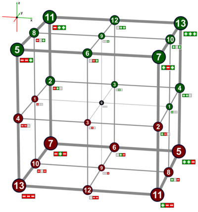 The following table shows the sign tuples together with likely ways to enumerate them. A binary enumeration with − as 1 can be easily generalized across dimensions. A binary enumeration with + as 1 defines the same order as balanced ternary. The Roman enumeration of the quadrants is in Gray code order, so the corresponding Gray code is also shown for the octants.