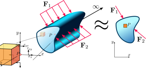 In real engineering components, stress (and strain) are 3-D tensors but in prismatic structures such as a long metal billet, the length of the structure is much greater than the other two dimensions. The strains associated with length, i.e., the normal strain [math]\displaystyle{ \varepsilon_{33} }[/math] and the shear strains [math]\displaystyle{ \varepsilon_{13} }[/math] and [math]\displaystyle{ \varepsilon_{23} }[/math] (if the length is the 3-direction) are constrained by nearby material and are small compared to the cross-sectional strains. Plane strain is then an acceptable approximation. The strain tensor for plane strain is written as: [math]\displaystyle{ \underline{\underline{\boldsymbol{\varepsilon}}} = \begin{bmatrix} \varepsilon_{11} & \varepsilon_{12} & 0 \\ \varepsilon_{21} & \varepsilon_{22} & 0 \\ 0 & 0 & 0 \end{bmatrix} }[/math] in which the double underline indicates a second order tensor. This strain state is called plane strain. The corresponding stress tensor is: [math]\displaystyle{ \underline{\underline{\boldsymbol{\sigma}}} = \begin{bmatrix} \sigma_{11} & \sigma_{12} & 0 \\ \sigma_{21} & \sigma_{22} & 0 \\ 0 & 0 & \sigma_{33} \end{bmatrix} }[/math] in which the non-zero [math]\displaystyle{ \sigma_{33} }[/math] is needed to maintain the constraint [math]\displaystyle{ \epsilon_{33} = 0 }[/math]. This stress term can be temporarily removed from the analysis to leave only the in-plane terms, effectively reducing the 3-D problem to a much simpler 2-D problem.
