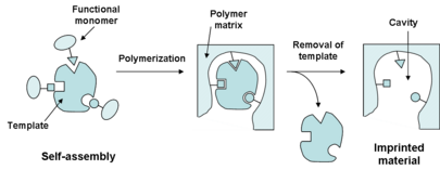 Molecular imprinting is a process by which polymerization of a polymer around template result in the polymer matrix with embedded templates.[2][5] After the template is removed, a cavity results with the functionalized monomers within the polymer cavity. This cavity is the idealized position for drug loading since this process can be designed specifically to recruit and hold onto drugs due to chemical specificity.[2][5] This technique can be better visualized by referring to Figure 3.0. This type of drug loading can be used as a way to create a pH responsive system, which releases drug(s) as the pH of the biological system changes.[2][5] Some drugs that have been successfully loaded via this method are: timolol, norfloxacin, ketotifen, polyvinlypyrrolidone, and hyaluronic acid.[5][10][11] The molecular structures of each of these drugs are shown below in the index of important scientific terminology.